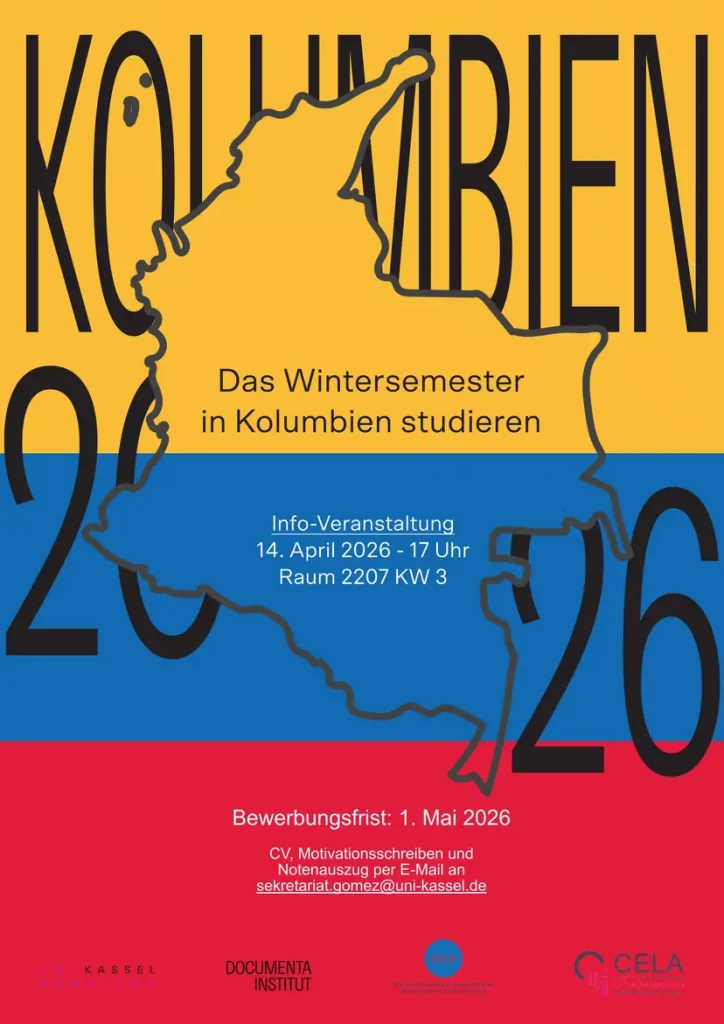Das CELA, in Zusammenarbeit mit Kunst & Gesellschaft und dem documenta Institut, schreibt dieses Jahr wieder vier Vollstipendien für studentische Auslandsaufenthalte in Bogotá/Kolumbien aus. Die Aufenthalte finden während des Wintersemesters 2026/2027 an der Universidad del Rosario statt. Flug und Aufenthalt für die Dauer des Austausches werden übernommen. Die Stipendien stehen Studierenden der Kunsthochschule Kassel, der Architektur sowie aller geistes- und sozialwissenschaftlichen Studiengänge zur Verfügung.